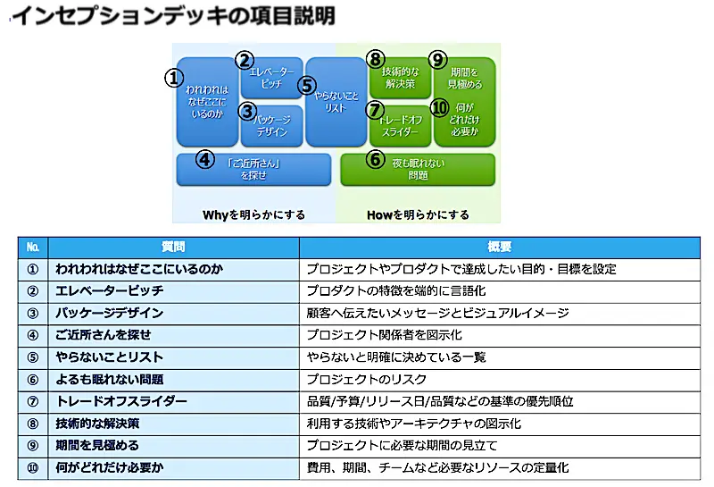 この際にチームが合意しておく事項を話し合っておくのに使えるのが「インセプションデッキ」です。インセプションデッキとは、プロジェクトのメンバー全員がプロダクトに関して共通の認識と目標を持つために作成するものです。
