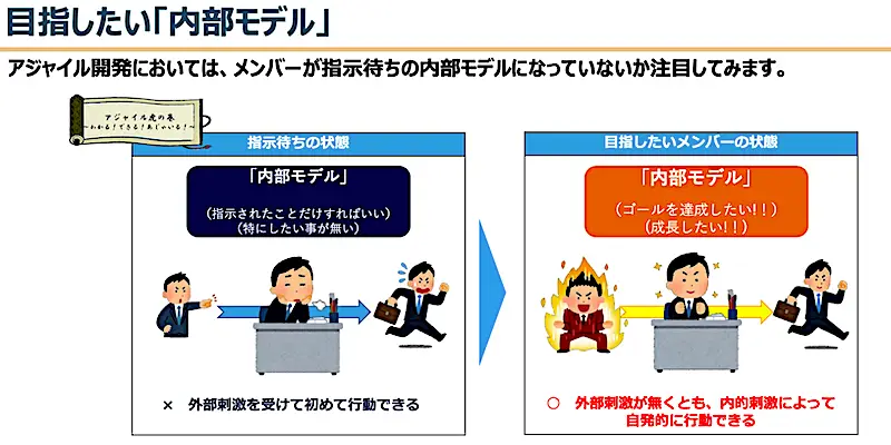 そのような、「自分たちならできる」という自信や能力に対する認知(エフィカシー)を上げることで、自律型組織が作られて、アジャイルが確実に実施されることを、チームの経験から導き出しました。