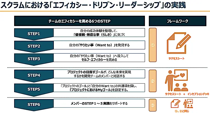 そして、チームのエフィカシーを高める進め方を6つのステップとして説明されています。この6ステップの詳細と、フレームワークとして使用するサクセスシートについては、虎の巻に解説されています。