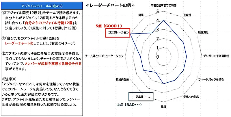 アジャイルホイールの進め方とレーダーチャートの例(虎の巻より)