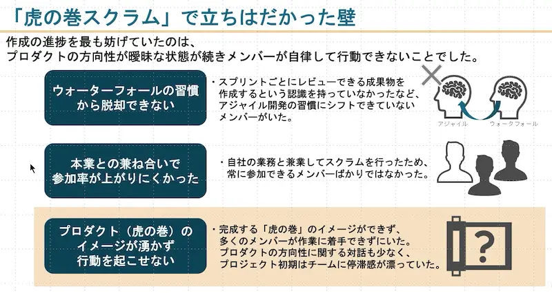 虎の巻の作成は、「スクラム」と呼ばれる代表的なアジャイル開発の手法で行っています。そして、その際に直面した課題(壁)が、作成した虎の巻の中身にも反映されています。