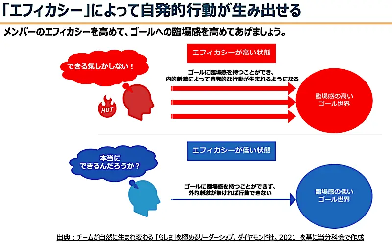 そして、自律的に行動できるチームを作るには、リーダーシップのやり方も見直す必要があるでしょう。メンバーのエフィカシーを高める様なリーダーシップによって、ゴールに向かうためのメンバーの自発的行動を生み出すことにつながります。