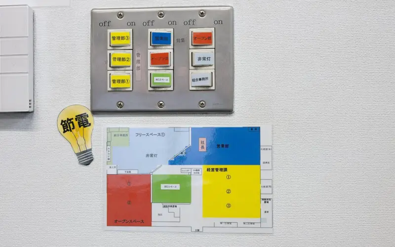 改善活動は社内のいたるところで行われている。照明のスイッチはフロアの位置が色分けで一目でわかるように